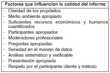 Existen muchos factores que pueden influenciar la calidad del informe final en investigaciones con gruposde discusión.