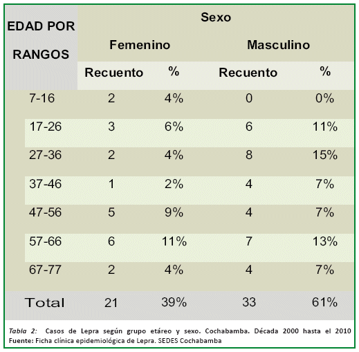 The Objectives to evaluate the clinical and epidemiological behavior of leprosy for which we performed a retros-pective longitudinal study in the Department of Cochabamba during the decade from 2000 to 2010 represented by 54 cases.