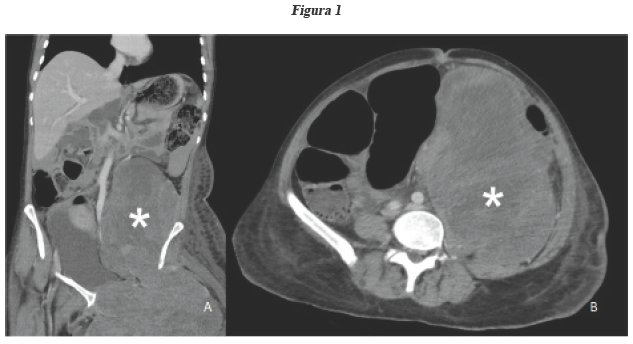 Se trata de una paciente mujer de 45 años procedente de Perú, portadora de Sarcoma Sinovial (SS) monofásico de muslo izquierdo, sin seguimiento después de mala respuesta a la quimioradioterapia. Ingresó 6 meses después, por un cuadro compatible con obstrucción intestinal. Al examen físico, se encontró un abdomen distendido y doloroso a la palpación, a nivel de tercio superior de muslo izquierdo una extensa tumoración de bordes irregulares, de 30 cm que ocupa la totalidad del compartimiento anterior. La tomografía de abdomen mostró una extensa tumoración que compromete el músculo ilíaco izquierdo y condiciona obstrucción intestinal, asociado a edema del miembro inferior izquierdo (ver Fig. 1). La paciente negó el tratamiento quirúrgico.