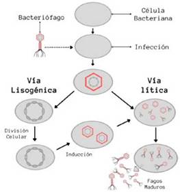 Figura 2 Representación esquemática de las dos vías del ciclo replicativo de un bacteriófago