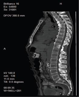 Estudios de orina revelaron hematuria con 28-30 eritrocitos por campo y bacterias escasas de etiología Klebsiella spp. Se realizó Tomografía Axial Computarizada (TAC) de abdomen y pelvis, mostrando enfermedad diverticular, y Resonancia Magnética (RMN) de columna que evidenció lesión tumoral sólida en T11, con compresión del cordón medular (ver imágenes 1 y 2) y adenomegalias en T9 y T10. Además, se detectaron hemorroides grado I y osteoporosis con desmineralización del 39%.