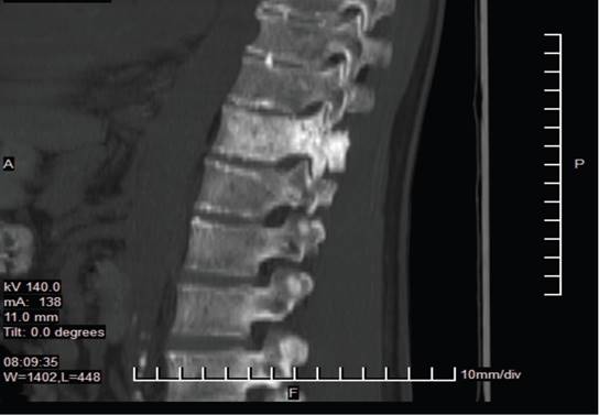 Figura 1: Infiltración metastásica en T11 (Corte sagital - Resonancia Magnética) Resonancia magnética sagital que muestra una infiltración metastásica en el cuerpo vertebral de T11, posterior a resección quirúrgica de su apófisis espinosa. Autoría: Clínica del Valle