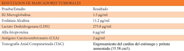 Neurocirugía realizó exéresis de la lesión. El análisis anatomopatológico evidenció neoplasia epitelial con necrosis tumoral. Los marcadores tumorales revelaron desviación de lactato deshidrogenasa (LDH) 275.8 pg/ ml, (ver Tabla 1). Colonoscopia: diverticulosis complicada y hemorroides internas. Ecografía mostró hepatomegalia.