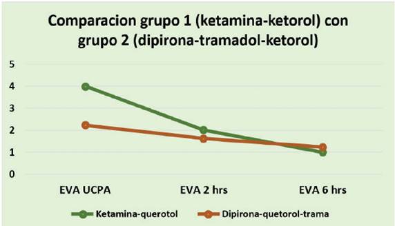 La relación de puntaje de la evaluación de EVA de cada paciente (n=30), evaluados en UCPA, a las dos horas y finalmente a las 6 horas. Se puede observar que la línea de seguimiento de EVA en área de UCPA, se encuentra con valores menores de escala de dolor en el grupo 2 (Dipirona-Tramadol y ketorolaco). Y posteriormente estos valores de EVA se van igualando en ambos grupos de estudio (Figura 1).