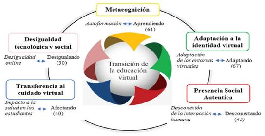 Con los hallazgos del estudio, se logró responder al objetivo de describir las relaciones e interacciones del proceso de transición que viven los estudiantes de nivel superior ante la educación virtual, que se tuvo durante la pandemia por COVID-19; durante el mismo, los estudiantes se vuelven consientes de la situación y desarrollan acciones necesarias a través de la metacognición para lograr adaptarse al entorno virtual, en donde la interacción social se transforma a otra totalmente diferente a la que estaban acostumbrados, convirtiéndose para ellos en una sensación de desconexión de la interacción humana; en el mismo contexto, son los estudiantes que por la naturaleza de sus actividades empiezan a cambiar rutinas, hábitos de alimentación y al empezar con los síntomas físicos de las largas jornadas frente a los monitores, consiguen en algunos casos ser conscientes de la afección que están sufriendo; finalmente esta la desigualdad tecnológica y social a la que se enfrentan algunos.