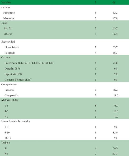 El presente trabajo es de tipo cualitativo con base en teoría fundamentada constructivista 7,8, se empleó un muestreo por conveniencia. La muestra estuvo conformada por 11 estudiantes de nivel superior (licenciatura y posgrado) que se encontraban inscritos en el ciclo escolar primavera 2021, que corresponde al segundo semestre de confinamiento por la pandemia, quienes cursaban clases de manera virtual, y que aceptaron participar de manera voluntaria, se les explicó el objetivo de la investigación, la confidencialidad del manejo de los datos, procediendo a firmar el consentimiento informado.