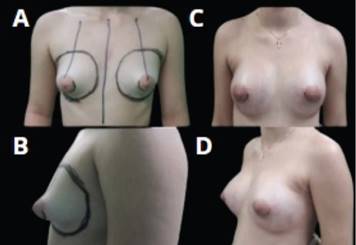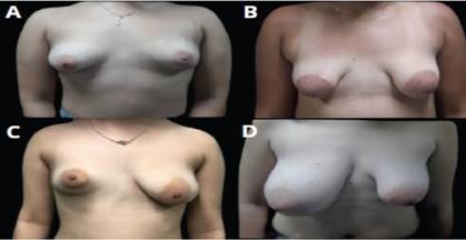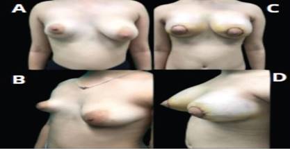 Figura 5. Pre y posoperatorio mastoplastia de aumento bilateral con implante mamario de 300 ml en mama derecha y 190 ml en mama izquierda; A. Preoperatorio vista frontal; B. Preoperatorio vista oblicua izquierda; C. Posoperatorio vista frontal; D. Posoperatorio vista oblicua izquierda