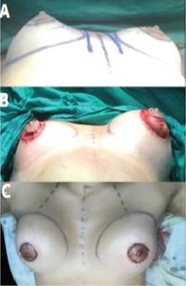 Figura 2. Técnica quirúrgica; A. Preoperatorio inmediato; B. Transoperatorio de mastoplastia con implante y abordaje periareolar; C. Posoperatorio inmediato