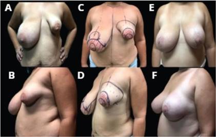 Figura 3. Pre y posoperatorio mastoplastia de aumento con implante mamario de 300 ml plano retromuscular y abordaje periareolar en mama izquierda más mastoplastia reductora por técnica Strombeck modificada en mama derecha con cierre en T A. Preoperatorio vista frontal; B. Preoperatorio vista oblicua izquierda; C. Planificación preoperatoria vista frontal; D. Planificación preoperatoria vista oblicua izquierda; E. Posoperatorio tres meses vista frontal F. Posoperatorio tres meses vista oblicua izquierda