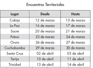 Las representaciones departamentales coordinaron los Encuentros Territoriales que mostraron diferentes características en cada región. En Trinidad se notó el monopolio ejercido por un grupo de instituciones lideradas por la Prefectura, el Comité Cívico y la Universidad pública, además de otras que no incluyeron en sus demandas a las organizaciones sociales de extracción popular. La poca o ninguna coordinación de los movimientos sociales a nivel nacional, no permitió que las organizaciones trinitarias se preparen y den a conocer la subordinación a la que las tienen sometidas quienes controlan y manejan las principales instituciones públicas y privadas de la región.