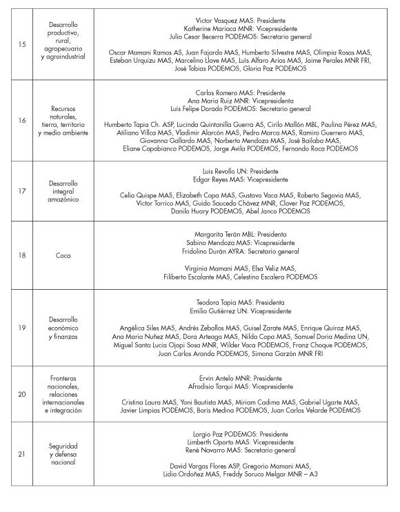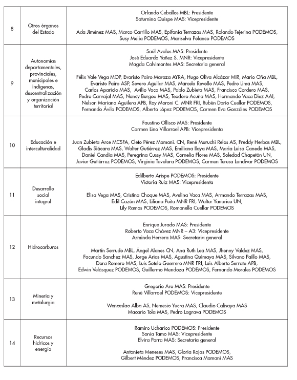 La instancia de coordinación y decisión política de la Asamblea Constituyente estaba conformada por la Directiva (11 miembros) y los Jefes de Bancada (16 miembros), totalizando 27 constituyentes. Se conformó 21 comisiones detallas al final de este artículo.