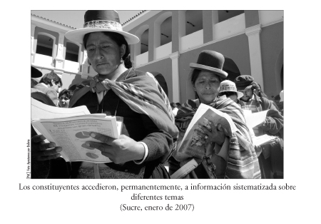 a) El esquema más experimentado es el que se monta en apoyo a la Confederación Indígena del Oriente de Bolivia, Federación de Mujeres Bartolina Sisa, Asamblea del Pueblo Guaraní, Coordinadora de Pueblos Étnicos de Santa Cruz, Confederación Nacional de Ayllus y Markas del Qullasuyu, etc., matrices de las principales organizaciones indígenas, originarias y campesinas del país, articuladas en el Pacto de Unidad, por parte de las organizaciones no gubernamentales tradicionalmente vinculadas a su asesoramiento técnico15. La CSUTCB fue la excepción. Desde un principio montó su propio equipo de trabajo y se articuló al bloque de la mayoría. La Confederación de Colonizadores, con muchas menos posibilidades, hizo algo parecido. Sin embargo, es importante precisar que cada organización manejó su propio esquema de trabajo sobre la base de sus históricas demandas, la construcción técnica de sus propuestas y la relación con la bancada de mayoría en la cual, salvo las organizaciones indígenas de tierras bajas, tuvieron una importante cantidad de constituyentes.