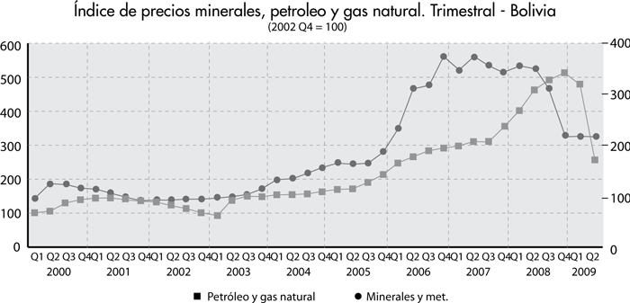El índice de precios para materias primas exportadas por Bolivia (Jordán, 2008) para el período 2002-2009 muestra que para los precios de los metales, el petróleo y el gas natural existe una perfecta simetría con el ciclo industrial de la economía mundial.