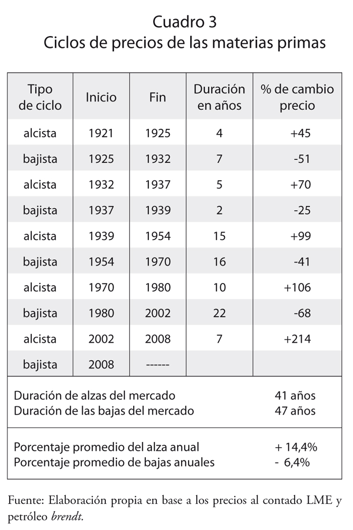 En las cuatro últimas décadas los mercados de productos básicos metales e hidrocarburos han experimentado períodos de auge con características diferentes en cada uno de los tres ciclos cortos que observamos hasta el año 2009. El primer ciclo va de 1972 a principios de los años noventa. El segundo ciclo empieza en 1991 y termina el año 2002. Por último, el ciclo que en su fase de auge va desde 2003 hasta finales de 2008 y empieza en su fase bajista el año 2009.