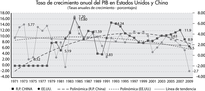 Como se puede observar en el gráfico de los ciclos de las economías de Estados Unidos y China (Gráfico 3), luego de un larga expansión mundial hasta 1970, el ciclo industrial y el de los precios de las materias primas dejaron de ser simétricos. Luego de treinta años (1970-2001) con trayectorias dispares, ambos ciclos vuelven a encontrarse el año 2002 en la sima de la crisis. Con el inicio de la fase expansiva mundial de 2002 también suben los precios de las materias primas; esta simetría se mantiene pese al ingreso a una nueva fase de recesión mundial a fines del año 2008. En el último ciclo (2002-2009) se observa otra vez la trayectoria sincronizada del ciclo en ambas fases, como se puede observar en la trayectoria del ciclo de los precios de las materias primas desde 1920-2004 (gráficos 1 y 2) y la trayectoria del crecimiento en Estados Unidos y China (Gráfico 3).