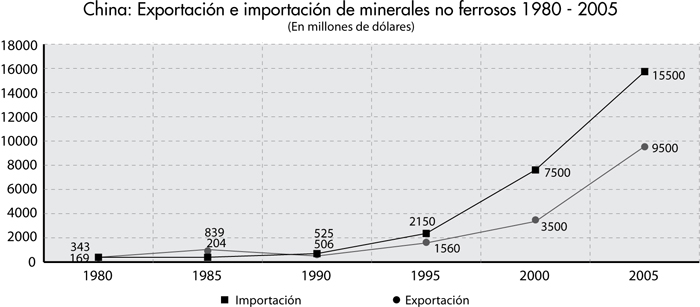 Este balance del mercado externo de China de minerales metálicos ferrosos y no ferrosos y de minerales energéticos, muestra que la avidez de China por materias primas metálicas y energéticas tiene que ver con la dimensión sin precedentes en el pasado7 y el impacto mundial del proceso de rápida industrialización de este país.