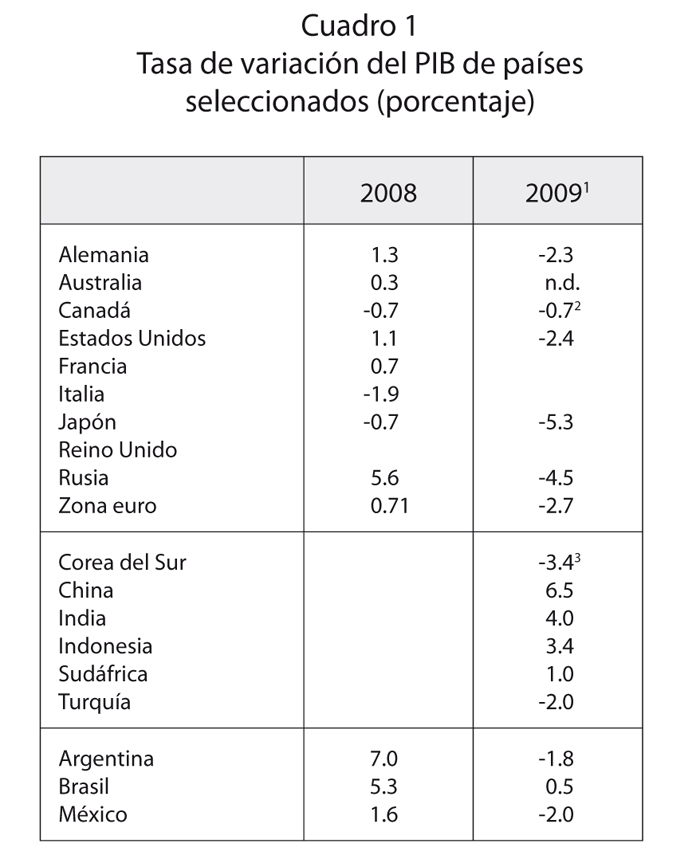 Fuente: http://www.cesla.com; http://www.destatis.de; http://www40.statcan.gc.ca; http://www.bea.gov; http://www.insee.fr; http://www.istat.it; Banco Mundial. Perspectivas económicas mundiales. Actualización de las proyecciones 30 de marzo de 2009.