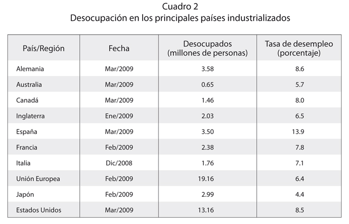 Actualmente, el incremento de desempleo se está produciendo de manera más fuerte, en los países industrializados afectados por la recesión económica. Así, por ejemplo, el desempleo en los Estados Unidos pasó de una tasa de 7,2% equivalente a 11.1 millones de personas, para diciembre de