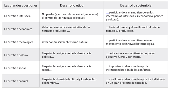 Se admitirá sin dificultad, en efecto, que el desarrollo es imposible si las condiciones que figuran en la columna de la derecha no son reunidas: no se concibe (y más hoy día) un desarrollo sin participación en los intercambios mundiales, sin crecimiento económico diversificado, sin innovación tecnológica, sin un gobierno fuerte, sin una buena institucionalización de los conflictos y sin una fuerte movilización de la población. Son claras aquí, en efecto, las condiciones mínimas de éxito de un proyecto de desarrollo, sin las cuales no sabría ser duradero. Sin embargo, aun cuando estas condiciones son reunidas lo que es ya muy raro, es habitual que las tentativas se ahoguen rápidamente o no produzcan más que resultados decepcionantes y provisorios. ¿Por qué? Porque estas condiciones mínimas jamás resisten muy largo tiempo, si los actores no tienen en cuenta aquéllas que figuran en la columna izquierda, si no son ellas moderadas y guiadas por las exigencias de un desarrollo ético.