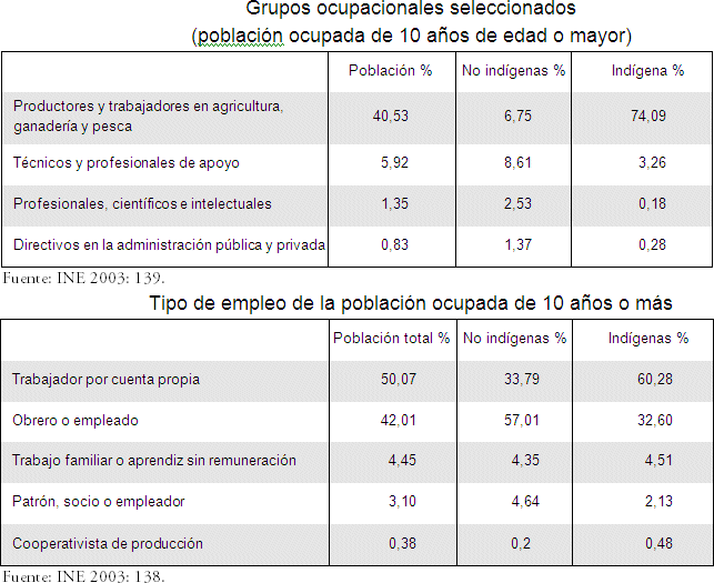 La superposición entre clase y etnicidad (en términos de indígenas frente a blancos) en Bolivia es patente tanto en las estadísticas como en la percepción popular. En lo que se refiere a la percepción popular, el hecho de que los vocablos indígena y campesino se usen indistintamente es muy sugerente. En cuanto a las estadísticas, existe una clara correlación entre estatus indígena y niveles de educación, ingreso y empleo. Por ejemplo, las siguientes tablas subrayan las diferencias en tipos de empleo para los grupos clasificados como indígenas y no indígenas en el censo del año 2001.