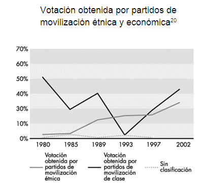 La primera y la más importante de las tendencias ilustradas por estos datos es que la etnicidad se ha hecho cada vez más visible en el sistema de partidos desde la transición democrática en 1982, y especialmente desde 1985. Se puede percibir esta tendencia en la gráfica comparando los resultados electorales de los partidos con banderas de clase y aquellos con banderas étnicas. Los datos sugieren que entre 1980 y 1993, el factor de clase perdió visibilidad política en general, mientras que la etnicidad se hizo más visible. Pese a que últimamente la atención se ha centrado en la presencia de los partidos indígenas en las elecciones del año 2002, estos datos nos recuerdan que las reivindicaciones étnicas también tuvieron bastante éxito en 1989, 1993 y 1997. Por tanto, más que reflejar un incremento súbito en la visibilidad de la identificación étnica, los resultados de las elecciones del año 2002 parecen vinculados a una tendencia de mayor alcance temporal hacia una creciente visibilidad de la etnicidad, que habría empezado en 1989 o antes.