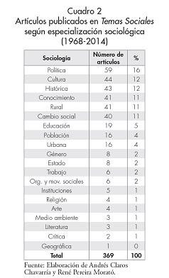 Se produjeron 369 artículos durante los 46 años de la revista Temas Sociales. De ellos la sociología política es la más destacada, con 59 artículos, seguida por las sociologías de la cultura, histórica, del conocimiento, rural y, finalmente, del cambio social. Entre todas las especialidades, un poco más del 73% del interés de los articulistas está aglutinado en estas cuatro especialidades.