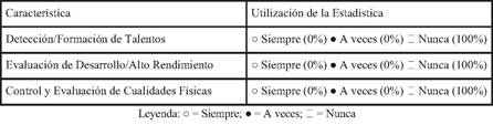 La observación directa de los entrenadores en las diferentes disciplinas deportivas en Cochabamba revela una marcada ausencia en la utilización de métodos estadísticos para la recolección, análisis e interpretación de datos en el ámbito deportivo. Este cuadro presenta datos preocupantes que indican una desvinculación entre la ciencia estadística y las prácticas de entrenamiento.