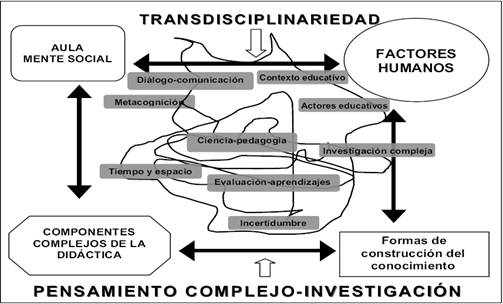Tomando en consideración el concepto de complejidad, ya no es posible hablar de proceso enseñanza aprendizaje como un sistema dual simple, tampoco se puede pensar solamente el proceso de aprendizaje y enseñanza de forma tradicional, y esto a su vez articularlo a investigación de aula o investigación científica compleja. En la complejidad, el aprendizaje no es un fin, es un proceso permanente donde el estudiante aprende, pero también desaprende y reaprende de tal manera que el objeto aprendido tiene varias aristas y varias formas de ser pensado, reflexionado, apropiado en su esencia compleja. En este sentido, podemos hablar de un proceso de desaprendizaje, reaprendizaje, aprendizaje y complejización de un objeto (PDRAC), que es un proceso no simple, no lineal, ni único, el aprendizaje debe llevar a la complejización del objeto a aprender. Este es un punto muy importante cuando hablamos de investigación, que en su sentido simple conceptual significa "indagar o seguir la huella de algo", desde el pensamiento complejo y entendiendo el PDRAC, investigar significaría indagar o seguir la huella compleja de algo". El siguiente esquema ilustra un poco la nueva visión de educación desde la complejidad que muestra cómo encarar, por ejemplo, la didáctica en la complejidad: