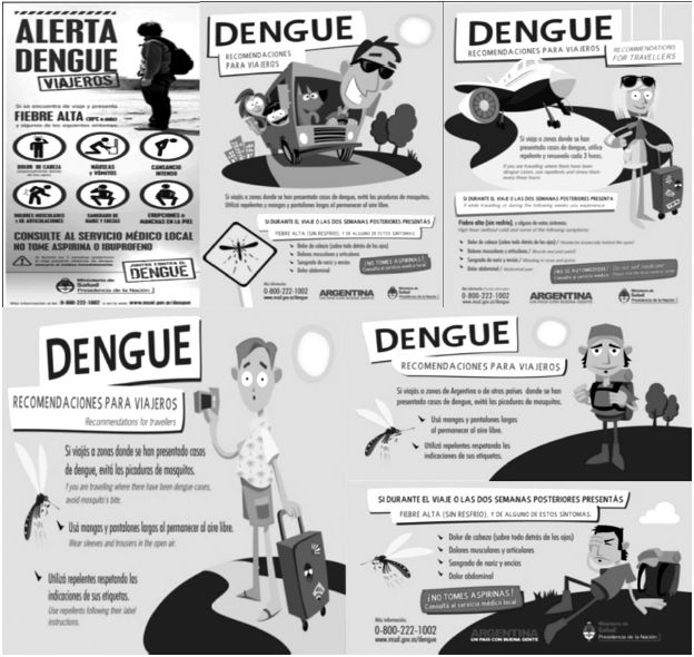 Los afiches incluidos aquí pertenecen al 2009 el que presenta una fotografía y al 2012-2013 los que son ilustrados. En el folleto más viejo el de la fotografía, se muestra a un clásico mochilero, de piel blanca y vestido con prendas de moda, así como usando las típicas zapatillas de viaje preparadas para las travesías, que cuestan mucho dinero y no son utilizadas por los migrantes de menores recursos. El destinatario parece ser un joven de clase media o media alta de Latinoamérica o de Europa, pero siempre de piel blanca. Se lo trata de "usted", por lo que se instaura una cierta distancia, y al referirse a la sala de primeros auxilios se la menciona como "servicio médico local", una acepción no empleada en el lenguaje cotidiano. La información es precisa: "Si se encuentra de viaje y presenta fiebre alta (38° C o más)"; "Si durante las dos semanas posteriores al viaje presenta síntomas de dengue, concurra al médico inmediatamente". Se muestra también el logo de la campaña: un sello en rojo que dice "Juntos contra el dengue".