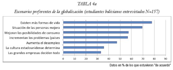 En la encuesta escrita, se consultó a los estudiantes sobre su percepción de los problemas respecto a los diferentes escenarios de los efectos de la globalización y su comprensión desde la perspectiva de transformación de su país. En la evaluación de las declaraciones de la globalización (Tabla 4a) los escenarios de una aprobación alta (57-78%), derivan de una opinión general positiva respecto a la "existencia de más formas de vida", "mejora de la situación de las personas" y "mejora de las oportunidades de consumo"32; los escenarios evaluados negativamente (desempleo, cultura, dominio de la economía). Posiblemente experiencias comunicacionales masivas (TV e Internet) juegan en este punto un rol decisivo para los estudiantes involucrados. Sin embargo, un 5 7 % de todos los encuestados teme que " los problemas de los países pobres incrementarán" dentro de los procesos de globalización, esta tendencia es aún más alta (62,7%) para los estudiantes varones. Para los jóvenes alemanes (2010), predominan las expectativas de "movimiento global" (84%) y "diversidad cultural" (80%). El temido "desempleo" tuvo una tendencia a disminuir respecto a 2006, pero todavía se encuentra en un 60% (TNS 2010, 172), respecto al temor a la "pobreza y el subdesarrollo", comparten el 53 % con los estudiantes bolivianos encuestados.