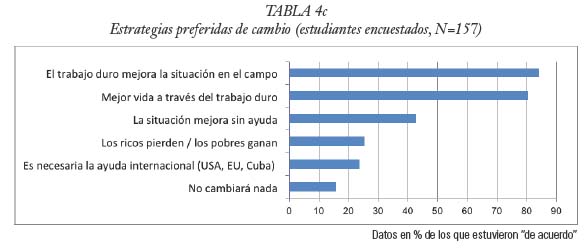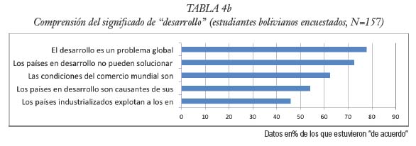 Para evaluar la situación de los países que están en transición, la gran mayoría de los estudiantes encuestados considera que esta situación es un "problema global que podría ser abordado por todos los países (78%)", dándole similar importancia (75%) a "los países en desarrollo deben abordar este problema con ayuda externa" (Tabla 4b). Respecto a la situación socio-económica de los países en desarrollo, más de la mitad de los alumnos encuestados coincide con la idea de que "el sistema económico mundial es injusto sin igualdad de oportunidades (62,2%)" dándole similar vigencia a "teoría de la explotación" (explotación sistemática de países en desarrollo por los países desarrollados) con más del 50% de los encuestados que constata esto, mientras que los estudiantes varones se diferencian en esta percepción sólo ligeramente. Detrás de eta percepción es también posible que haya influenciado la filosofía de cambio del "Vivir Bien", efectos de la política actual y de los medios de publicidad donde también se identifican nuevas oportunidades para el compromiso regional y global. El hecho de que la situación puede cambiar a través de "trabajo duro" (84,1%, estudiantes de sexo masculino 86,9%) y una mejora en la situación "sin ayuda externa (42%)" parece indicar un alto potencial de disposición al cambio; donde ya que "no cambiará nada" sólo fue aceptado por el 15,9% y la dependencia de la ayuda internacional requerida (EE.UU., UE, Cuba) también sólo por el 23,6%.