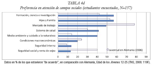 En cuanto al futuro del país y a sus propias prioridades de desarrollo social, los estudiantes bolivianos encuestados (Tabla 4d) identifican prioridad alta (56,7%) a los sectores "de educación o formación, ciencia e investigación" y "hijos y familia" (62,7% de los estudiantes, las estudiantes 47,7%), seguido de "mercado de trabajo (48%)" y "sistema de salud (42%)". También los "servicios ambientales y de conservación" tiene una importancia relativamente alta, pero también ponderada por género: Los estudiantes varones con el 31,9%, y las mujeres con el 52,4%, sin embargo. "La seguridad social y renta de vejez" parece ser relevante sólo para algunos de los estudiantes encuestados (12,7%). En cuanto a los jóvenes alemanes (2006) se presenta así "la organización de la sociedad" como importante y necesaria (40%), mientras que "la formación, ciencia e investigación (42%)", el "mercado de trabajo (78%)" y los "hijos y la familia" (53%) dentro a lo que se refiere como prioridades de diseño social.