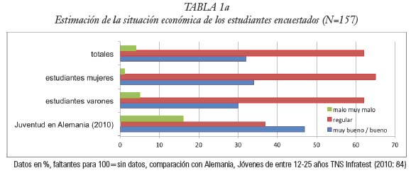 Situación económica actual de los estudiantes encuestados de ambas universidades públicas (UMSA/ESFM) se estima globalmente como predominantemente "suficiente" en un (68%), 21% se refieren incluso como "muy buena" y "buena", mientras que sólo unos pocos alumnos (6 %) expresan que su situación económica es "mala" o "muy mala" (ver Tabla 1a). Dentro de esta estimación juega un papel preponderante el hecho de que los estudiantes provienen de universidades públicas y en la mayoría de los casos de la región de La Paz, además por lo general siguen viviendo con sus familias. En comparación con otros jóvenes (amigos y familiares) el 70% de los estudiantes no se siente económicamente privilegiado, sólo el 25% acepta que su situación económica "es mejor o mucho mejor". Esto es diferente en comparación con los jóvenes en Alemania, que muestran claras diferencias describiendo su situación financiera actual como muy buena y muy mala, la estimación de esta última situación no se ha modificado desde hace más de 10 años.