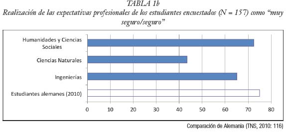 Respecto a las expectativas de estudio la gran mayoría de estudiantes bolivianos encuestados no cree que su trabajo y situación de vida vaya a mejorar por el propio estudio (después de alcanzar el objetivo del estudio). El impacto en obtener mejores oportunidades de vida fue señalado en un 75% como "no seguro". La realización de oportunidades "aspiraciones profesionales" son aceptadas de diferente manera en las diferentes facultades (Tabla 1b); en humanidades y ciencias sociales, los estudiantes son más propensos a reflejar un modelo de empleo. Respecto a este punto, en general los estudiantes alemanes son más optimistas, aunque esto no se aplica a todos los grupos de jóvenes por igual.