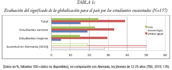 Al evaluar los estudiantes encuestados los efectos de la globalización para Bolivia (Tabla 1c) tienden a equilibrar las ventajas respecto a las desventajas con un 38,8% como grupo dominante. Entre la juventud alemana respecto al 2006 se muestra una ligera tendencia a ver más ventajas que desventajas (TNS, 2010: 171f), lo cual es especialmente real dentro del grupo de mujeres jóvenes encuestadas. En general, el grupo más numeroso de jóvenes es aquel que considera el equilibrio entre los pros y los contras. En Bolivia son los varones, quienes explicitan más las ventajas (24,8%)