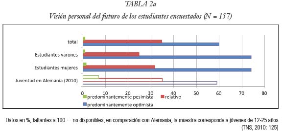 En su propia visión del futuro (Tabla 2a), la generalidad de los estudiantes bolivianos encuestados son optimistas (60%), lo cual es sorprendente, dadas las situaciones de riesgo en un país en transformación, tanto política como económicamente; además, contrastando las perspectivas globales como el estudio de la OIT (2012) donde se proyecta el desempleo juvenil mundial a escalas masivas. Sólo un porcentaje muy pequeño de estudiantes (alrededor del 1%) ve su futuro más bien sombrío, las estudiantes se muestran un tanto más escépticas que los varones. Respecto a este tópico los jóvenes en Alemania, tomando además en cuenta la crisis económica y financiera que actualmente representa un riesgo potencial significativo perceptible, muestran resultados comparables, puesto que se muestra optimismo (59%), aunque es variable de acuerdo a grupos, como lo identifican los estudios existentes (Véase TNS Infratest, 2010: 126).