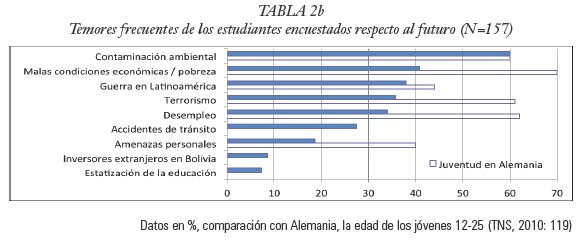 Como se menciona previamente gran parte de los estudiantes ve de manera optimista o relativa sus miedos personales para el futuro (Tabla 2b), el miedo a la "contaminación ambiental (60%)", "mala situación económica / pobreza (41%)" y "guerra en América Latina (38%)28" son la principal preocupación, muy por delante de los temores de "desempleo" y "amenazas personales". Comparativamente, los jóvenes en Alemania comparten el mismo porcentaje en relación a la "contaminación" (ambos 60%); pero por ejemplo en términos de "la propia situación económica / amenaza de la pobreza" y la amenaza de "desempleo" significativo existen diferencias, estos últimos parámetros entre los jóvenes alemanes tienen un lugar destacado dentro de su visión personal, aunque temporalmente y en términos reales, la tasa de desempleo de los jóvenes (2010) se redujo ligeramente. El gran énfasis, respecto a las cuestiones ambientales, entre las generaciones jóvenes de ambos países, podría estar influenciado mediáticamente y también por eventos actuales como la Conferencia Mundial sobre el Clima en Copenhague (2009).