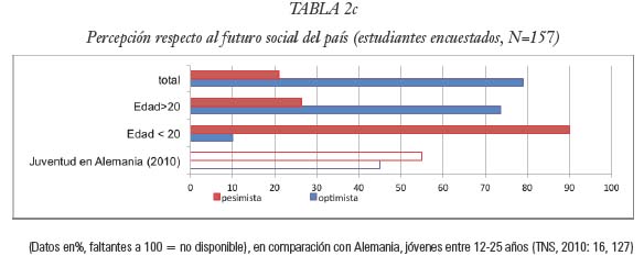 En su evaluación personal respecto al futuro social del país (tabla 2c), los estudiantes bolivianos son generalmente optimistas, perciben los actuales cambios políticos y económicos, como una oportunidad para el desarrollo social positivo. Aquí existe una diferencia entra la percepción de acuerdo a grupos atareos: el grupo de más edad es más pesimista (80%), los estudiantes varones y mujeres coinciden en sus resultados. Los jóvenes en Alemania (2010) en relación al futuro social del país, se posiciona como una "generación de jóvenes pragmáticos" siendo sólo moderadamente optimistas, aunque con una tendencia ligeramente positiva respecto a anteriores años29.