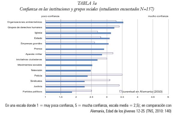 Para este punto, cuentan tanto las experiencias individuales como sociales de los estudiantes con estas instituciones en Bolivia. Como se puede apreciar en la anterior tabla, la percepción de los jóvenes en Alemania (2010) respecto a instituciones como los sindicatos, el poder judicial y la policía) tiene mayor potencial que en el caso de Bolivia (3,1 a 3,5). La confianza basada en "grupos de derechos humanos", "organizaciones ambientalistas" e "iniciativas ciudadanas" (3,0 a 3,5), es relativamente alta en ambos casos. En contraste, los partidos políticos, en ambos grupos recibieron el menor grado de confianza, articulando anteriormente un interés político relativamente alto (50-66%) por parte de los estudiantes encuestados en Bolivia y Alemania, respectivamente. La desconfianza de los adolescentes en los partidos políticos "los políticos se concentran sólo en sus intereses electorales y no los intereses de los electores" (Véase TNS Infratest, 2010: 142), en la escala de 1-5, el promedio en Bolivia fue de 1,5, en Alemania existe una percepción similar (Véase TNS Infratest, 2006: 116).