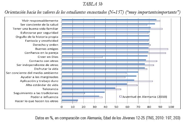 ¿Qué buscan los jóvenes en Bolivia y cuáles son sus normas de valor? Esto se expresa en las orientaciones de valor que se practican a través de la vida diaria. El perfil en la escala de valores de los estudiantes de las universidades públicas de La Paz y la juventud en Alemania (Tabla 3b) muestran similitudes, así como también diferencias. Tres cuartas partes de los estudiantes bolivianos valoran como "muy importante / importante" la "conciencia en salud (86,5%, 85,2%)", "una buena vida familiar (81,4%)", "imaginación y creatividad (79,8%), "seguridad (80,6%) y "ley y orden (79,7%)". Asimismo, la base de las relaciones personales " tener buenos amigos", "confianza en la pareja" y "contacto con los demás", pero al mismo tiempo "ser independiente" es de importancia para los estudiantes. En esto se muestra la correspondencia con la escala de valores y las orientaciones prioritarias de los jóvenes alemanes (2010), aunque los lazos micro-sociales, tienen valores más altos31, expuestos en la Tabla 3b. Asimismo, respecto a la evaluación de la "tolerancia" y el "conformismo (hacer lo que otros hacen)" no parece diferir significativamente. Las diferencias en el perfil de valores respecto a los jóvenes alemanes surge en la importancia a la orientación religiosa "creer en Dios (78,3% / 37%)", "orgullo de la propia historia (80,1% / 30%)" y "apego a las tradiciones" (39,3% / 21%).