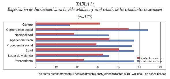 Uno de los momentos importantes de orientación personal e integridad social de los jóvenes encuestados corresponde a sus experiencias previas en situaciones de vida corriente y conflictos cotidianos: ¿A qué oportunidades reales se enfrentan en la actual Bolivia, por ejemplo, en función de su situación social, sexo, origen étnico, creencias, edad? Con este fin, se consultó acerca de sus experiencias de discriminación en la vida cotidiana y particularmente en los estudios. Inicialmente, hubo diferencias inequívocas en el tema género (Tabla 3c).