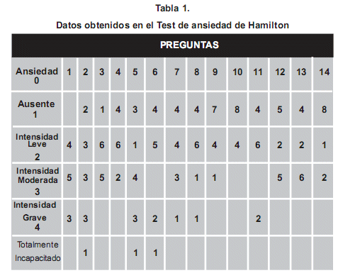 Nota: Datos acumulativos de los sujetos experimentales, en relación al nivel de ansiedad reportado en cada una de las catorce preguntas del Test de Hamiiton