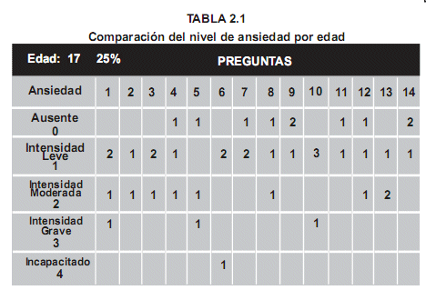 Se determinó que a un 25% de los sujetos experimentales con un rango de edad de 17 años presentaron 3 respuestas que denotaban índices de ansiedad grave y una a nivel incapacitante. Un 42% con un rango de edad de 18 años presentaron 6 respuestas de ansiedad grave y 3 de ansiedad incapacitante. Un 8% con un rango de edad de 20 años presento 2 respuestas de ansiedad grave. Se podría concluir que a menor edad el grado de ansiedad generado por un Estimulo novedoso es mayor.