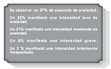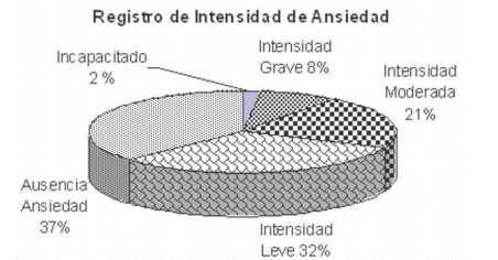 En la Figura 1 se tiene el porcentaje del registro acumulativo de la intensidad de ansiedad en las siguientes categorías: ausente, leve, moderado, grave o totalmente incapacitado.