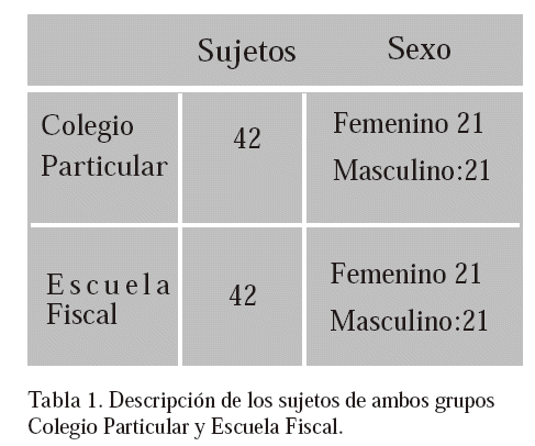 Los sujetos hicieron un total de 84 personas, 42 para el grupo Particular, y 42 para el grupo Fiscal. Las edades de los padres y de las madres se encontraron en el rango entre 28 y 36 años.