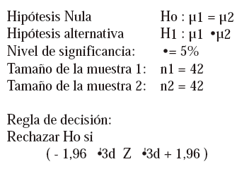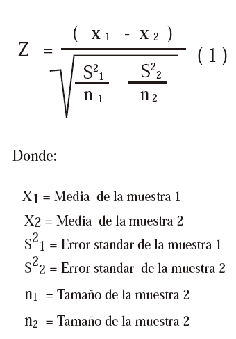 Para la prueba de hipótesis y cálculo del valor de probabilidad, se utilizó en todos los casos, el siguiente estadístico para la prueba referente a la diferencia de medias: