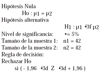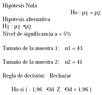 Para este tercer caso, utilizando la fórmula (1) y los datos de las medias muestrales y las desviaciones estándar correspondientes, se obtiene un valor z = 4,21 . Como este valor (z = 4,21) es mayor a 1,96 se rechaza Ho.
