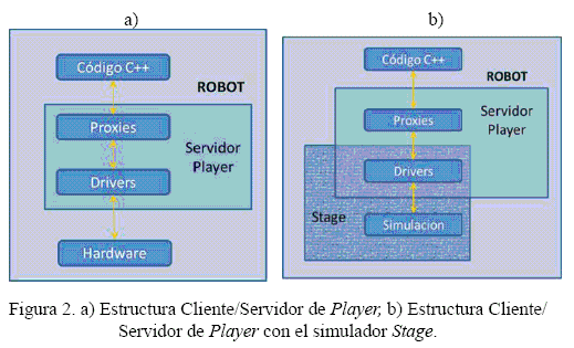 En la Figura 2 a) se muestra la estructura básica del Player cuando esta implementado en un robot y en 2 b), se muestra como es la estructura básica de Player con el simulador Stage.