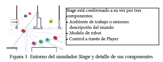 El componente Stage puede simular a uno o más robots móviles, sensores, objetos y el ambiente de trabajo para interactuar con el robot mediante un entorno bidimensional. Stage además proporciona la simulación de una amplia variedad de sensores y actuadores, tales como sonar, láser, dispositivos de detección de color por visión, odometría y otros. En la Figura 3 se puede observar una imagen de la versión Stage 3.2.2, simulando varios robots, obstáculos y el campo de visión por láser.