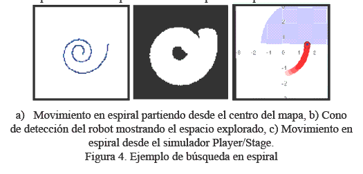 La idea principal de realizar una búsqueda en espiral es examinar la mayor parte de un ambiente desconocido sin repetir el espacio recorrido. En la Figura 4 se puede ver una exploración en forma de espiral seguido del resultado del cono de detección, como se puede ver fácilmente gran parte del mapa está siendo explorado con este tipo de búsqueda.